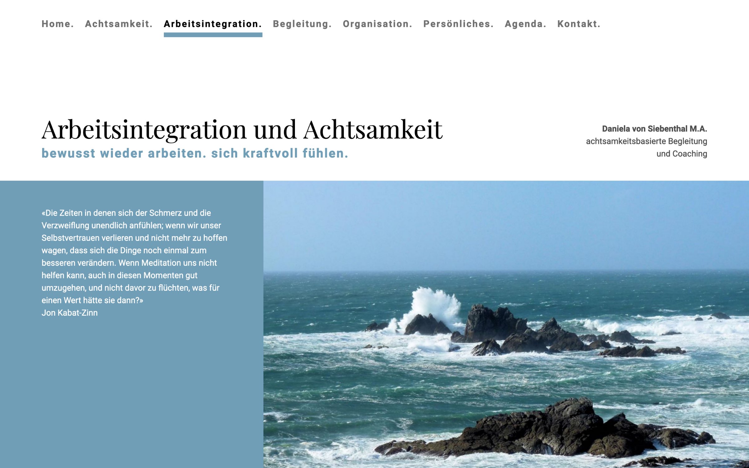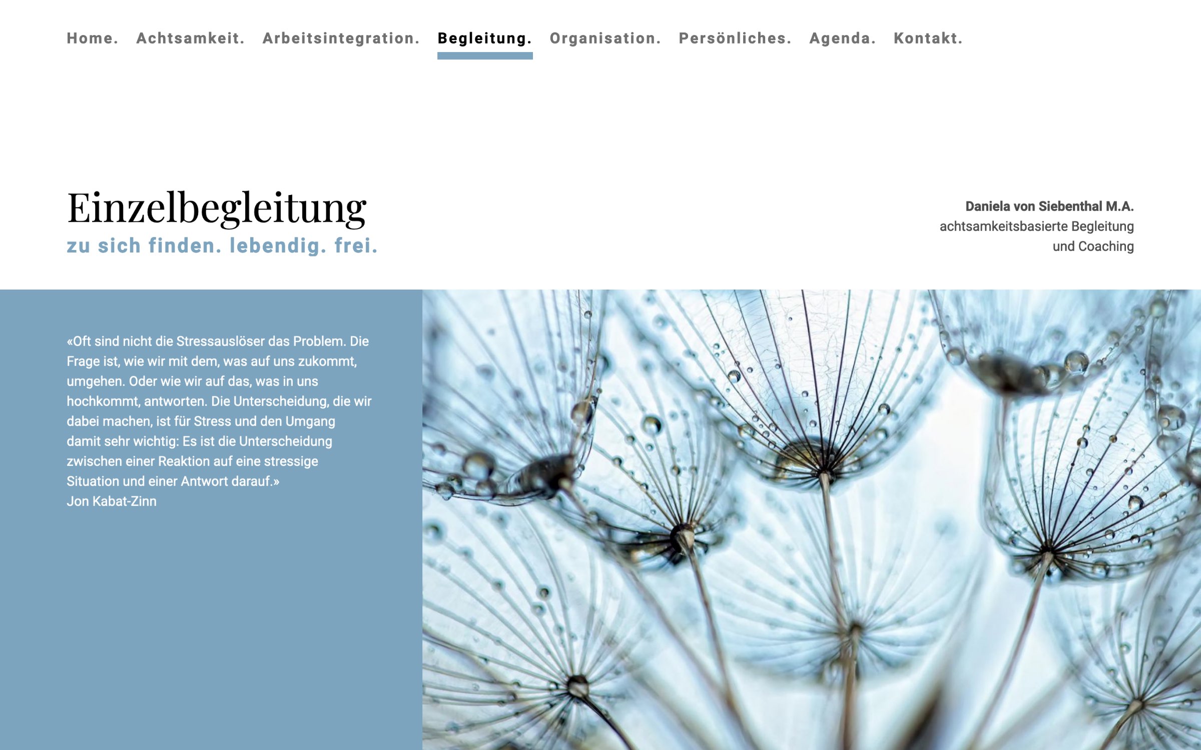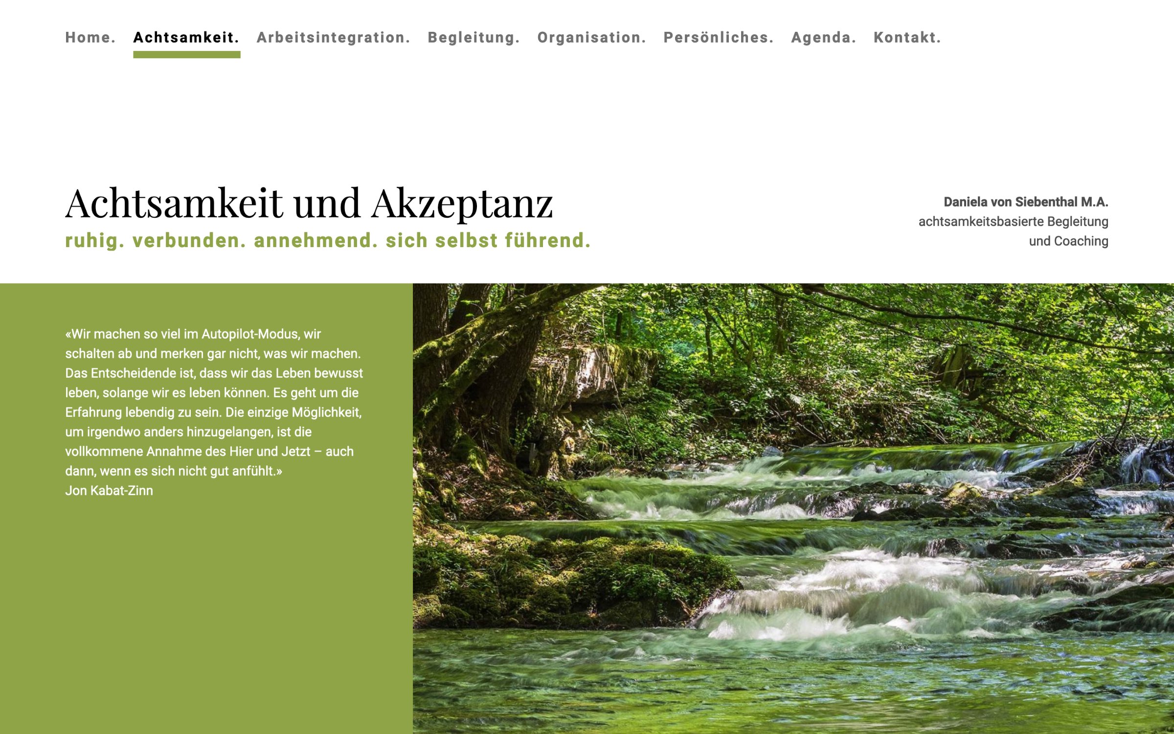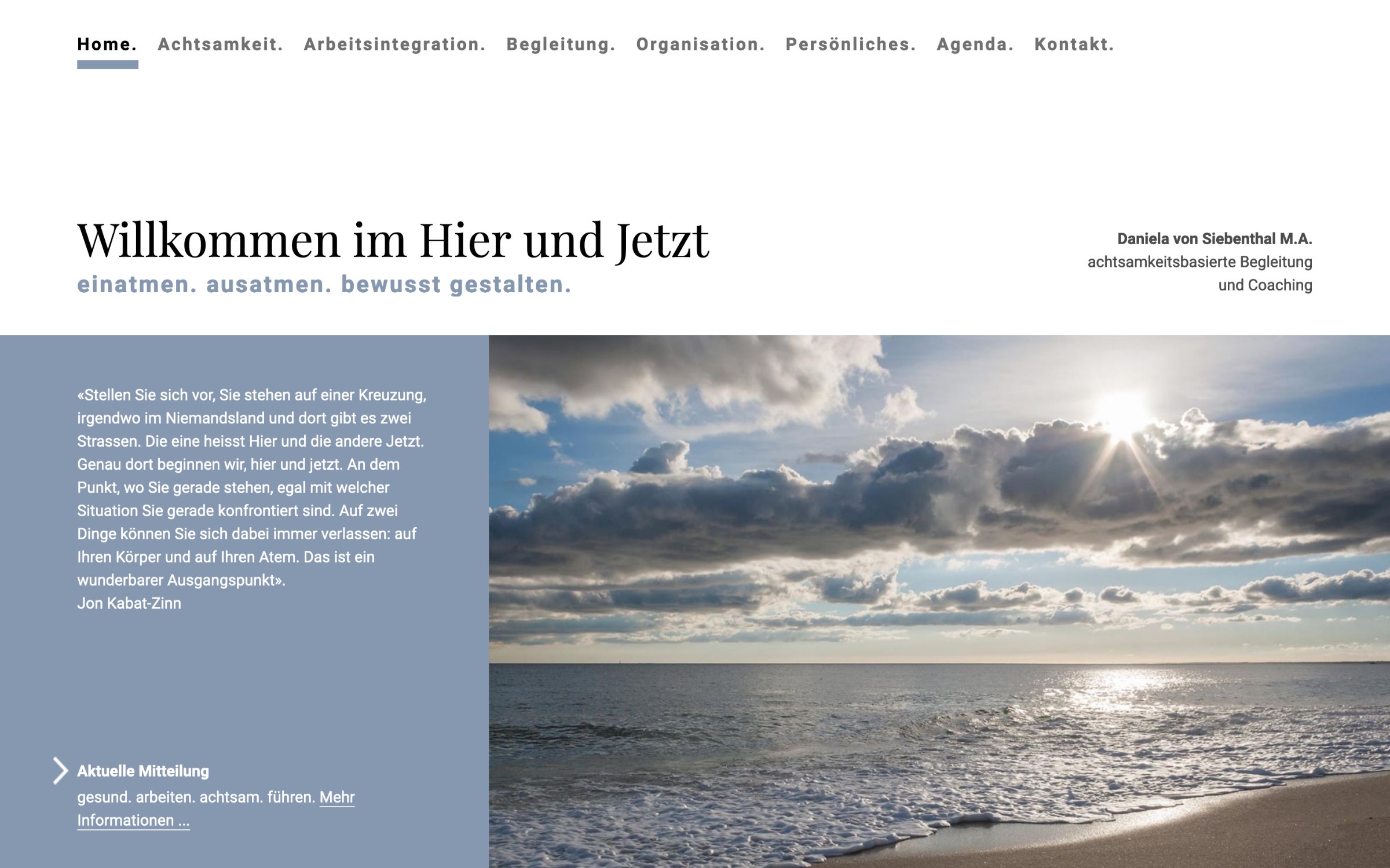 Die Entwicklungen in der Arbeitswelt haben die Lebens- und Arbeitsbedingungen der Menschen tiefgreifend gewandelt. Viele Berufstätige erleben ihren Beruf als psychisch belastend. Achtsamkeitsbasierte Begleitung und Coaching ist ein wertvolles Hilfsmittel in der immer komplexer werdenden Arbeitswelt. Wir wurden mit dem grafischen Konzept und der Gestaltung dieser anspruchsvollen Homepage beauftragt.