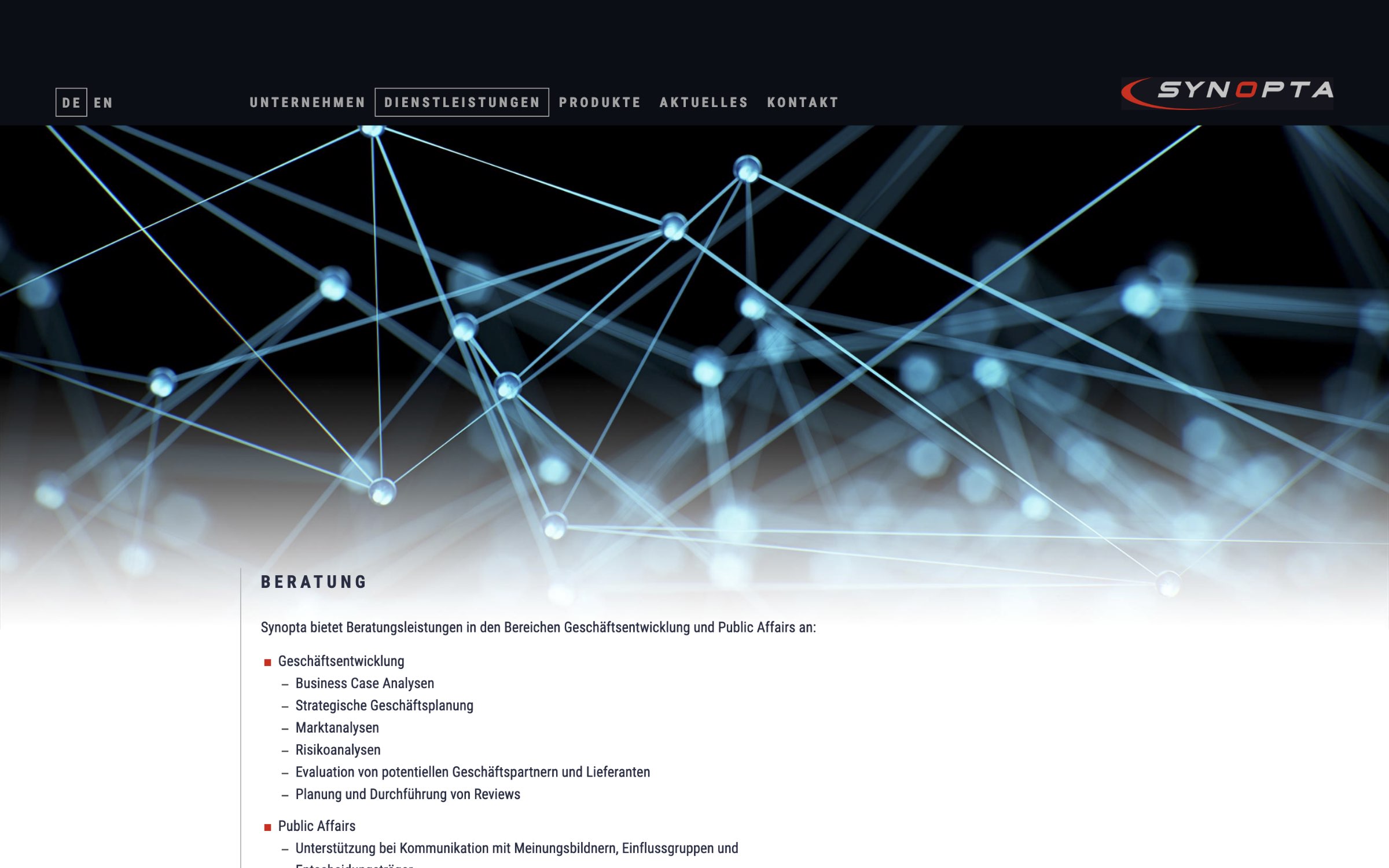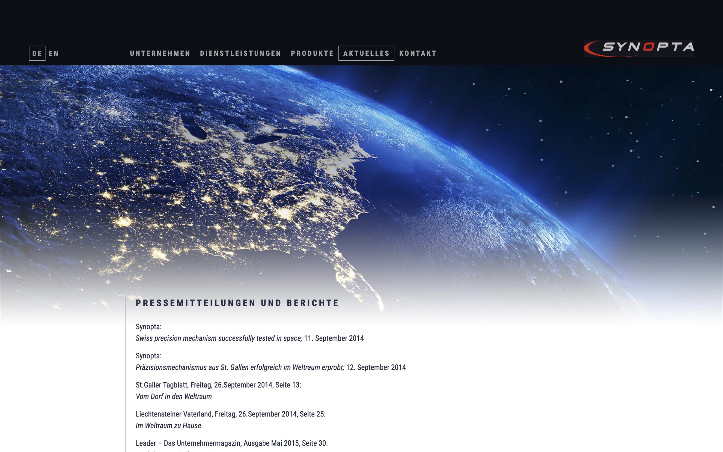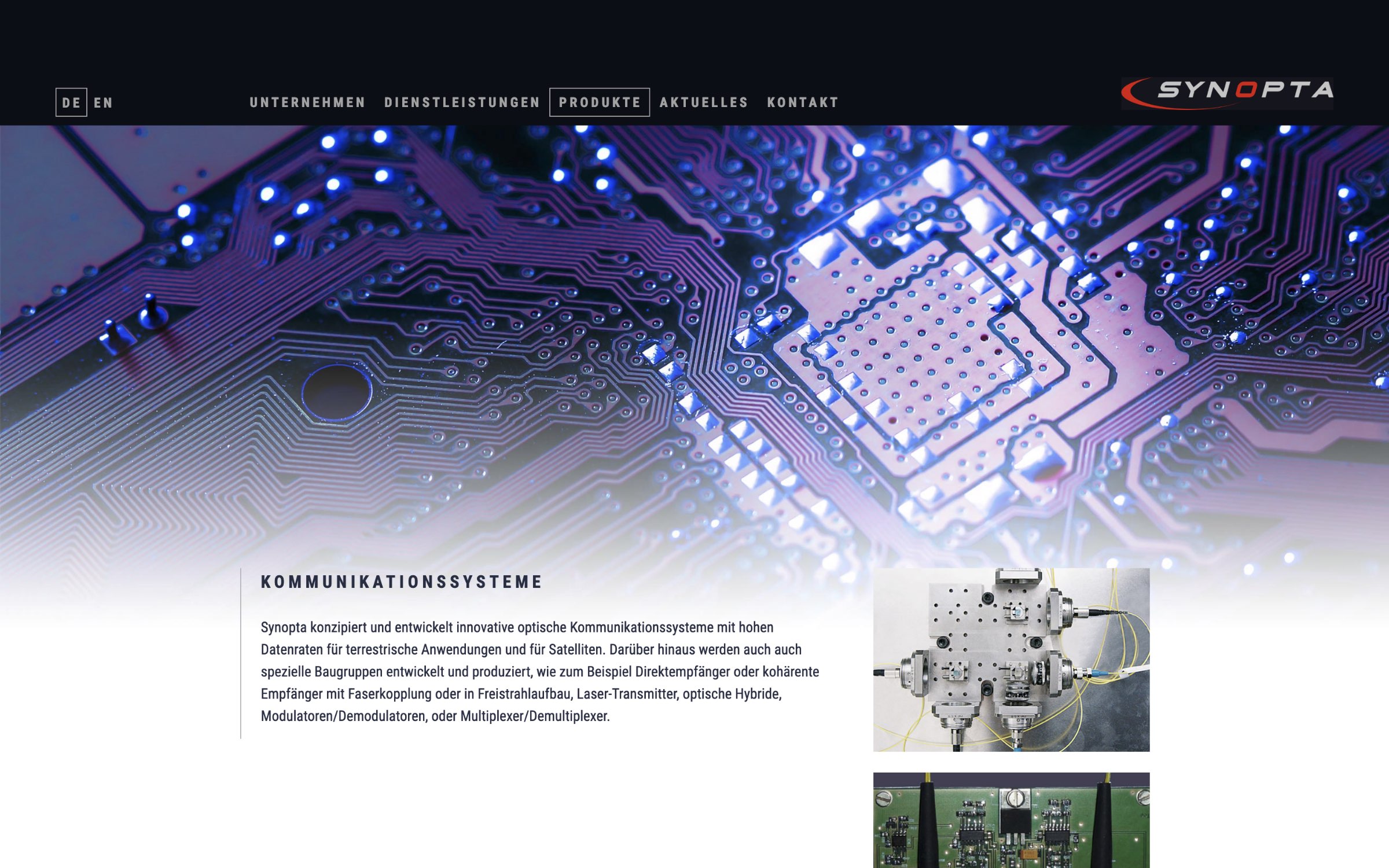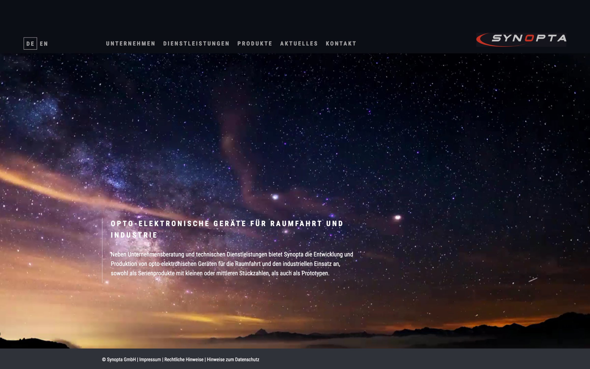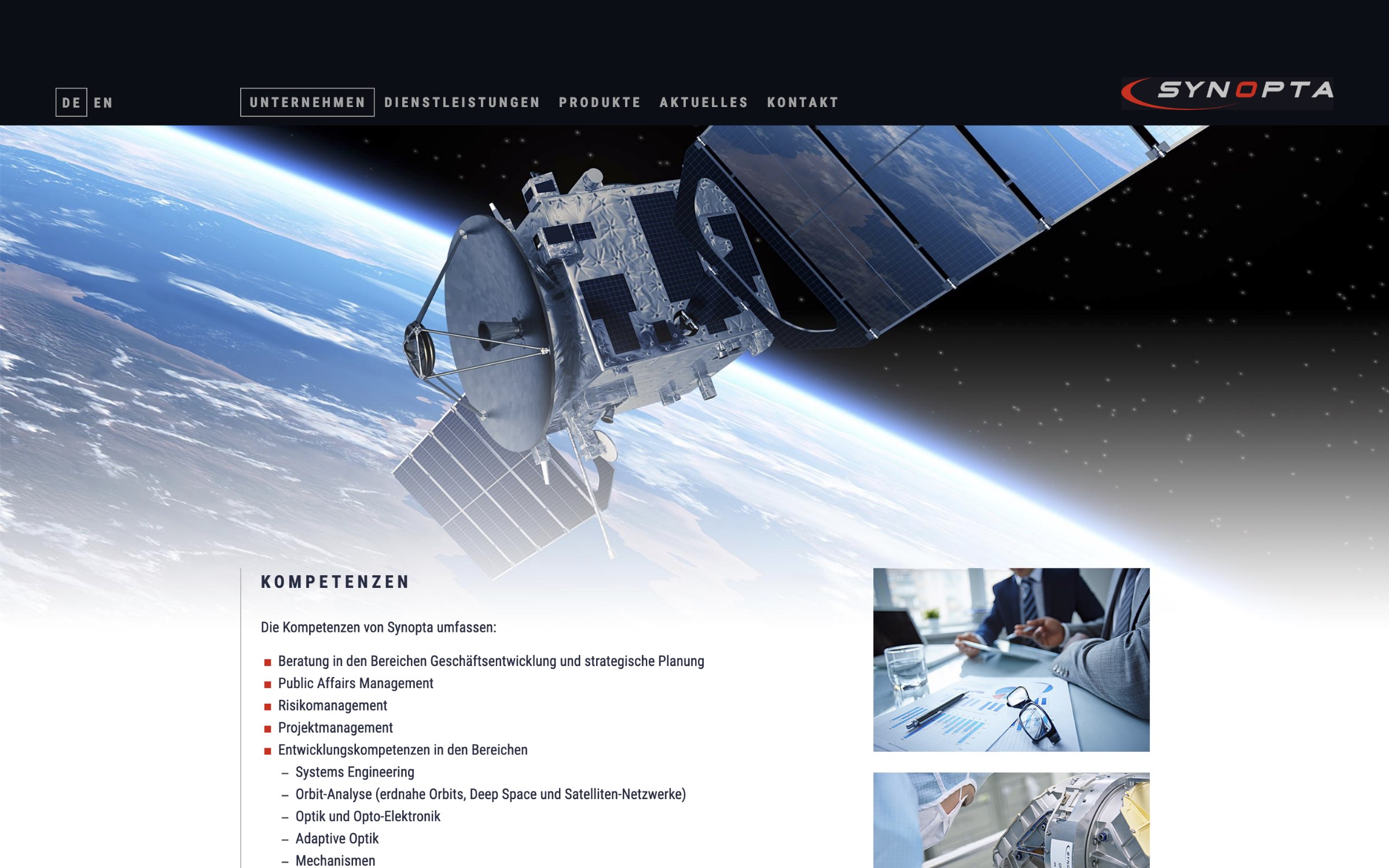 Die Firma Synopta bietet neben Beratungs- und Dienstleistungstätigkeit die Entwicklung und Produktion von komplexen opto-elektronischen Geräten für die Raumfahrt und den terrestrischen Einsatz an. Für das Hightech-Unternehmen durften wir die Unternehmenswebsite gestalten.